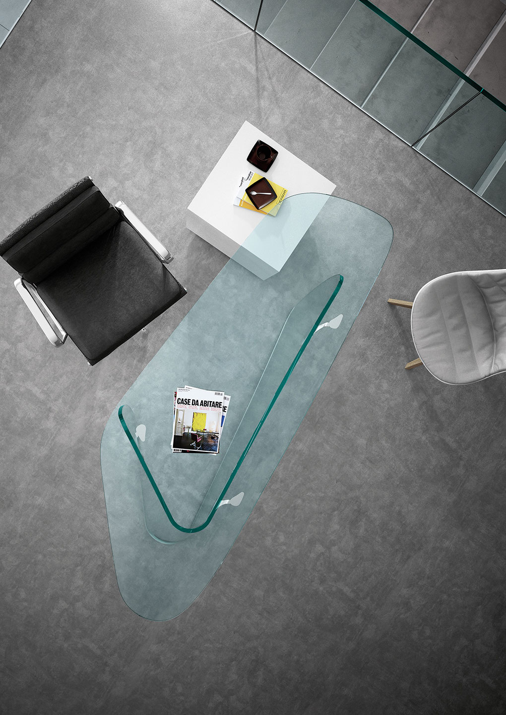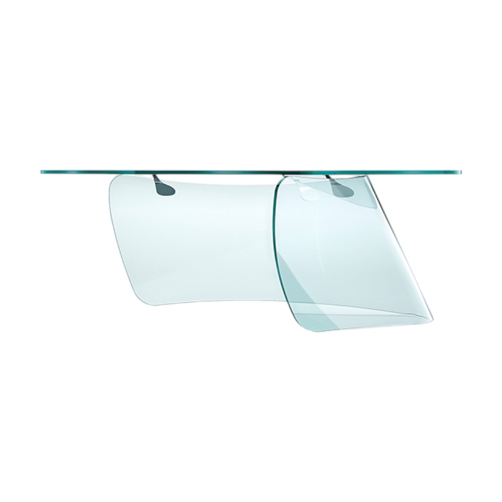 The Graph desk, designed by Xavier Lust for FIAM, features a 19 mm curved transparent glass base and a 15 mm glass top, complemented by stainless steel hooking plates. Lust is known for creating tension in his designs and utilizing curves inspired by his unique metal surface deformation techniques, also evident in his Caldeira mirror.