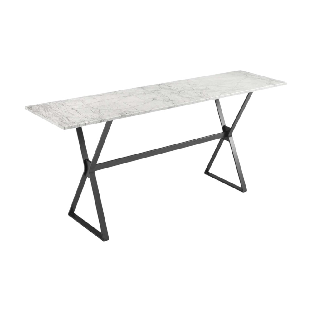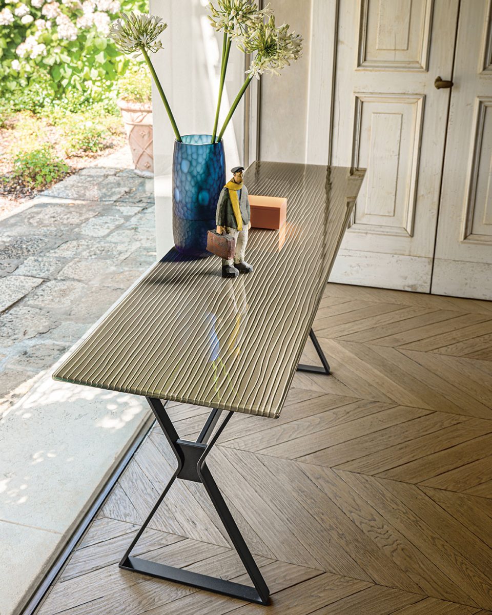 This console features a 12 mm glass top, tempered and back-painted in metallic colors, with an optional marble finish. Supported by a painted metal base in Lava Grey, the design showcases a dynamic aesthetic inspired by the graphic lines of equilateral hyperbole. The top’s living surface, sometimes deliberately imperfect, rests on a precisely machined steel base, blending elegance with strength.