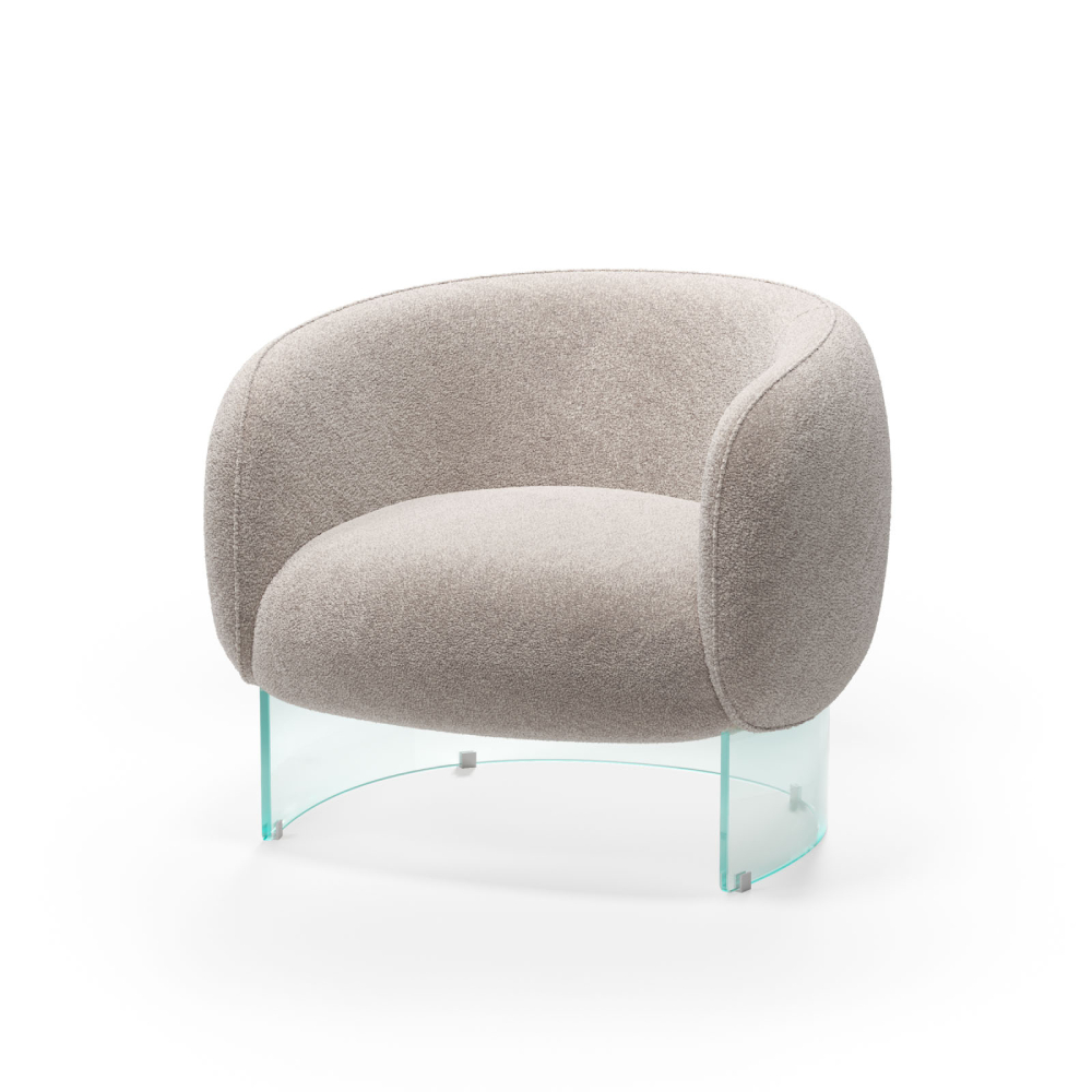 Armchair with internal structure in (metal and) plywood. Seat and backrest padding in polyurethane. Base in 10 mm curved glass. Feet in brushed or black anodized aluminum. The armchair can be upholstered in leather or fabric: refer to the available upholstery categories. Removable structure only in the fabric versions.