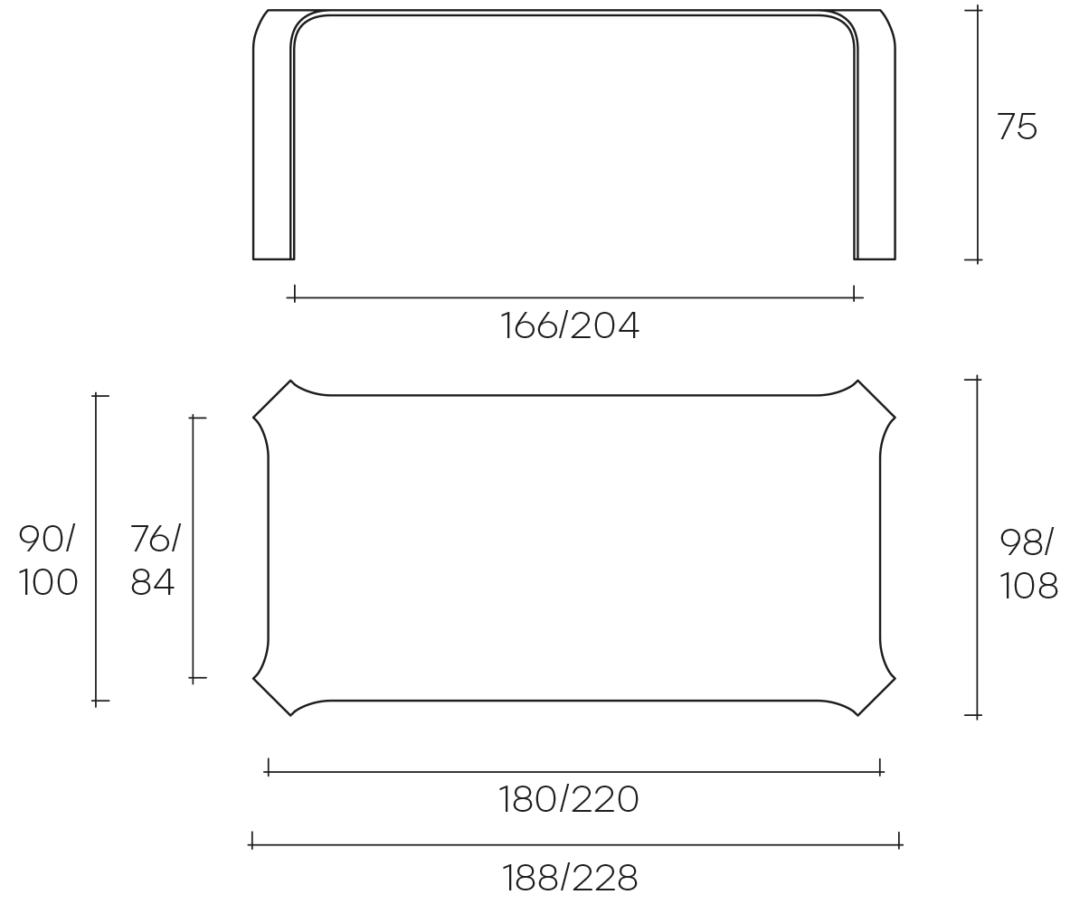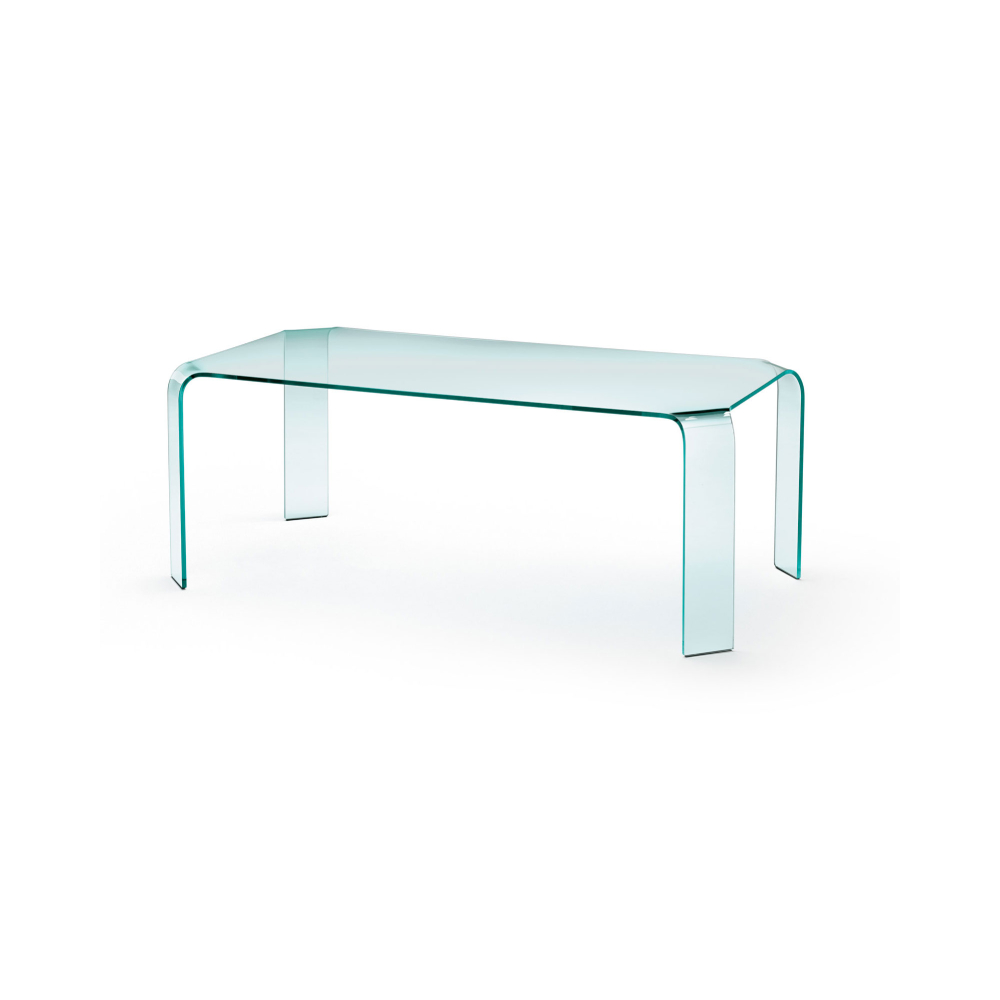 Monolithic table in 15 mm transparent curved glass or extralight glass.