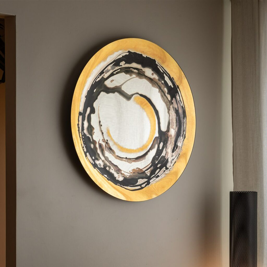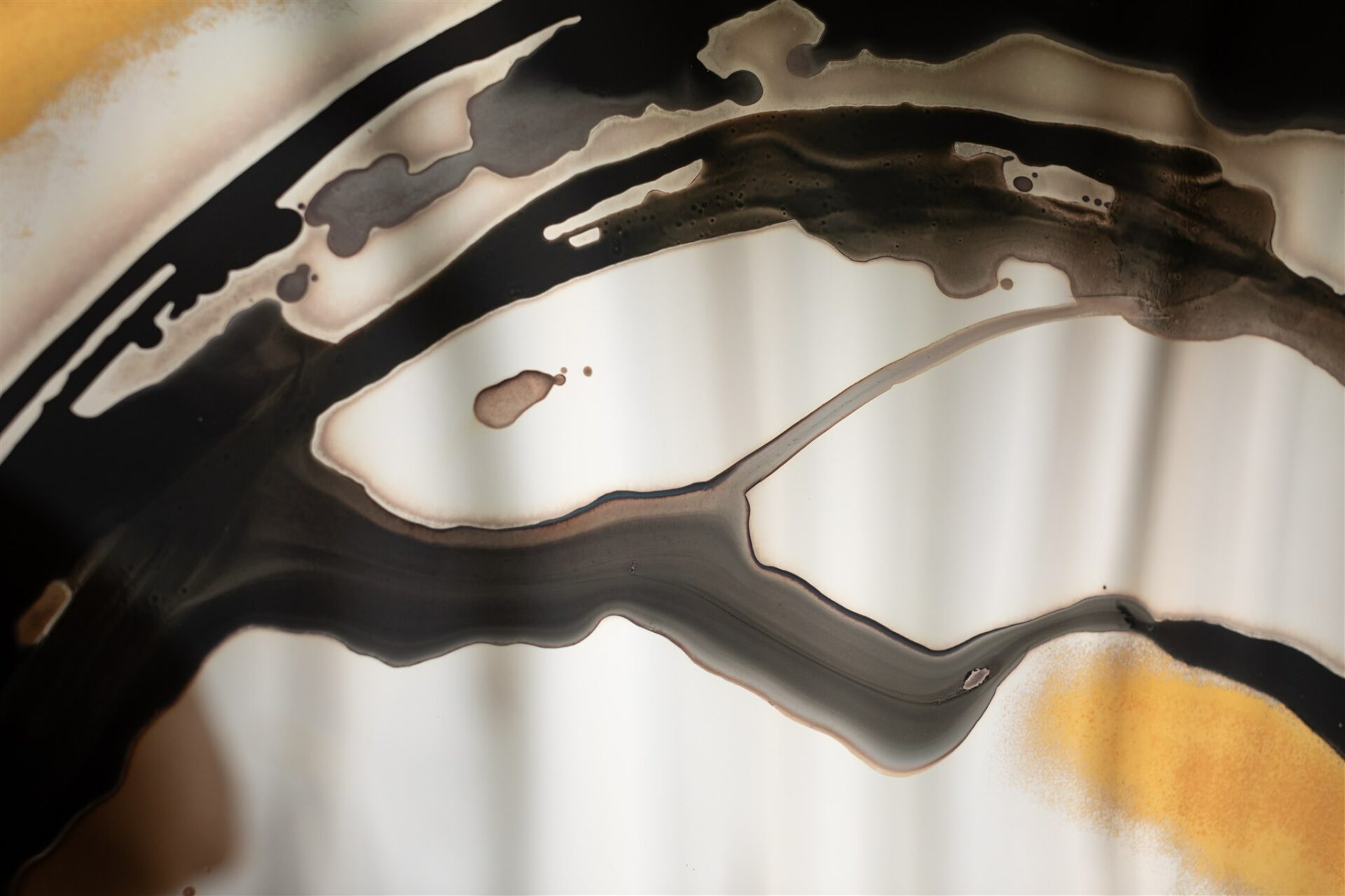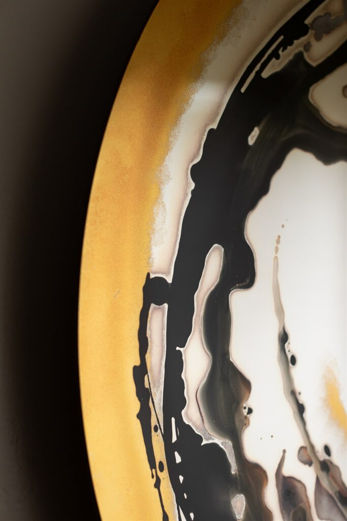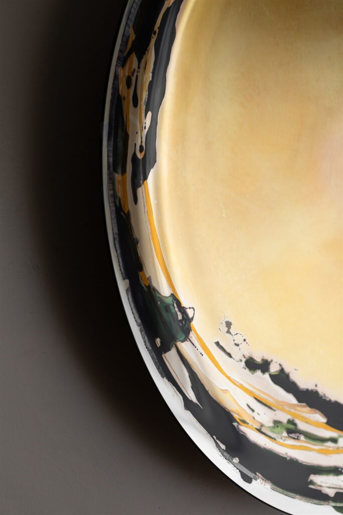 Gold luster and ceramic enamels on ultrawhite glass, mixed techniques.
